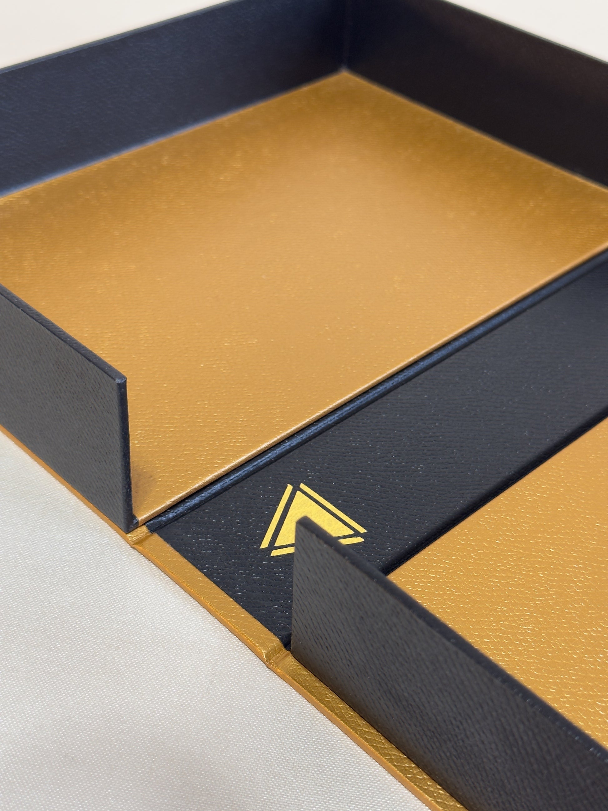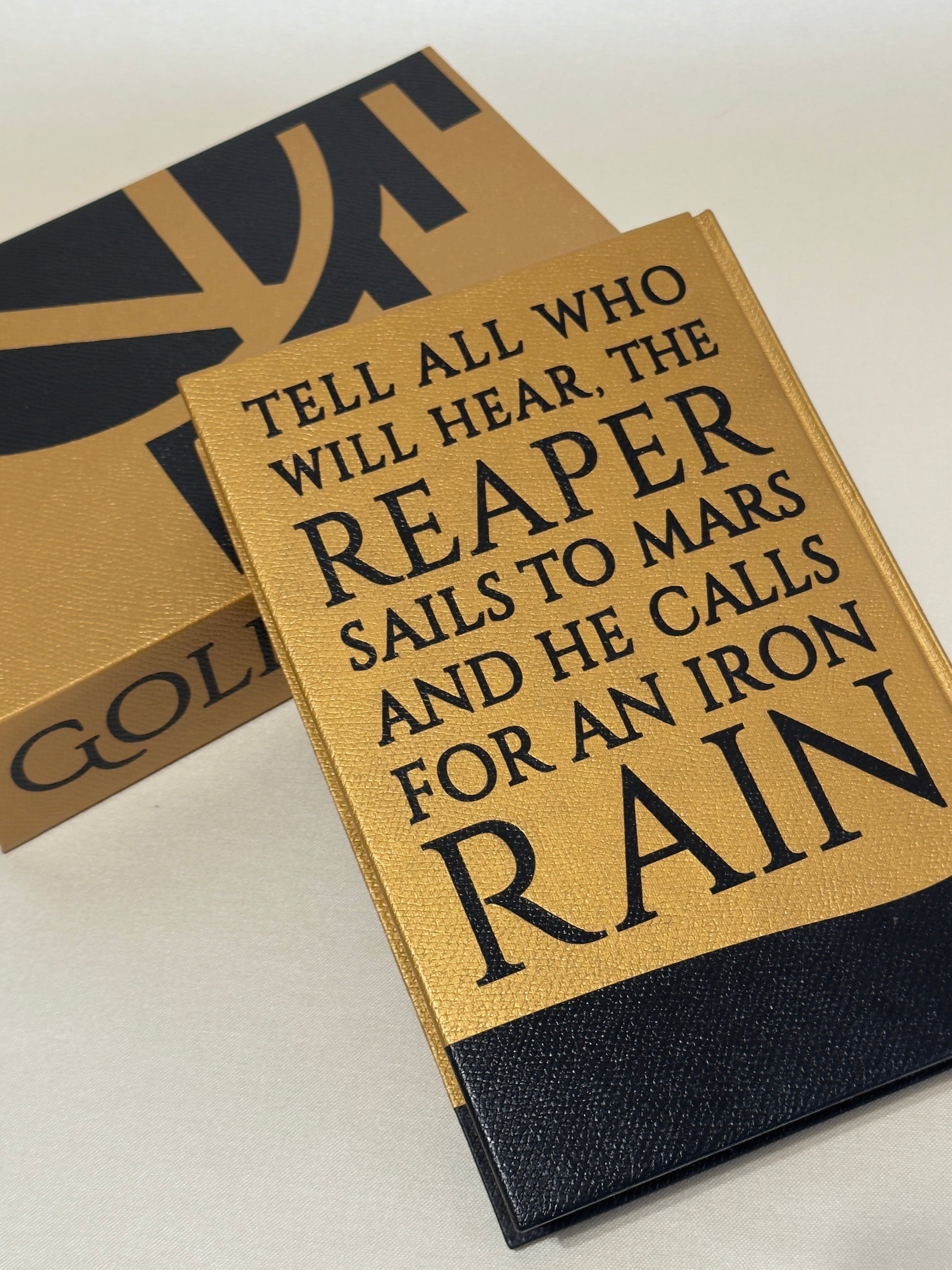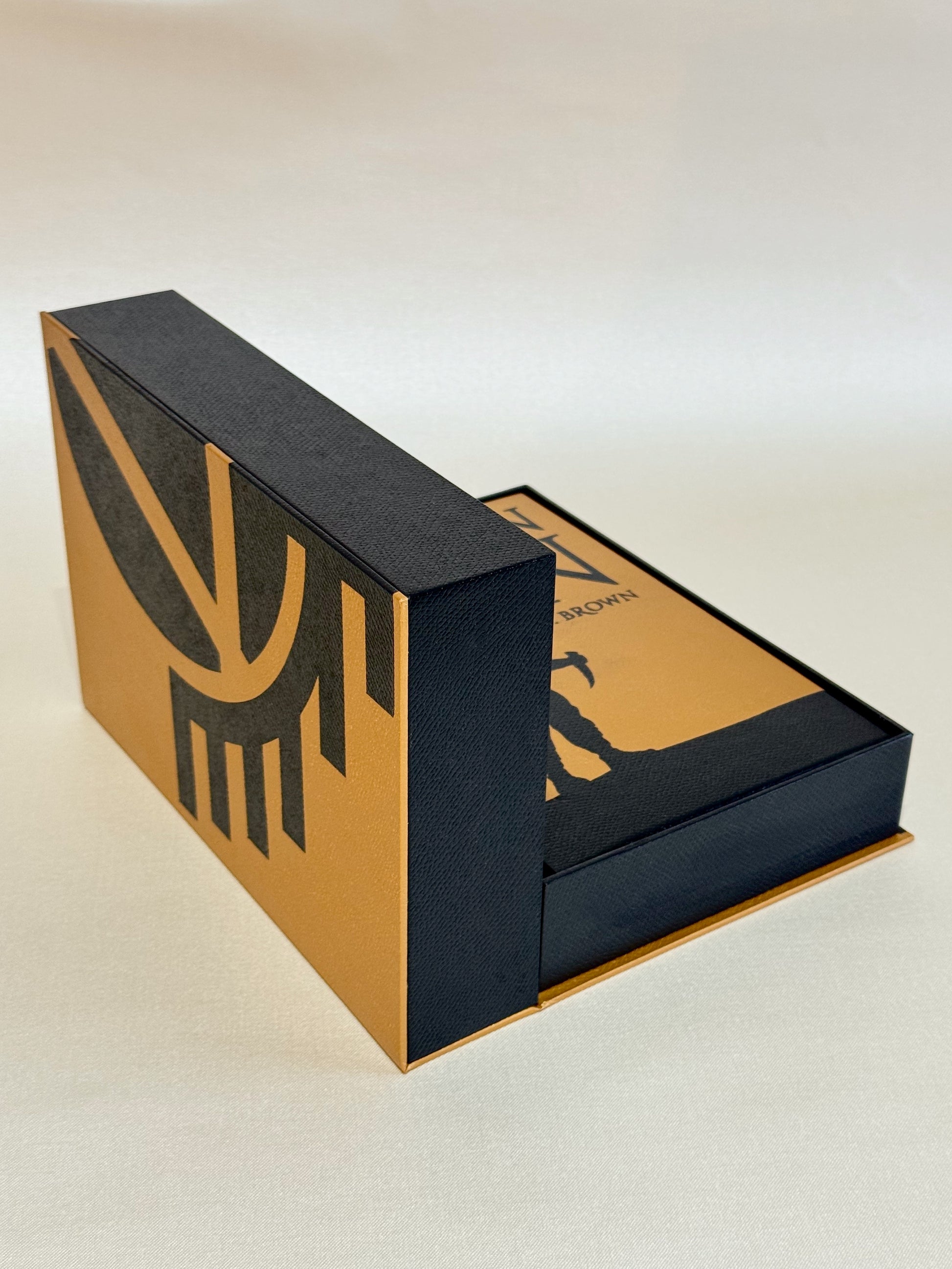 - Optional: matching slipcase or clamshell box. Both will have the same exterior design, the Gold sigil on both sides and the title on the spine.
