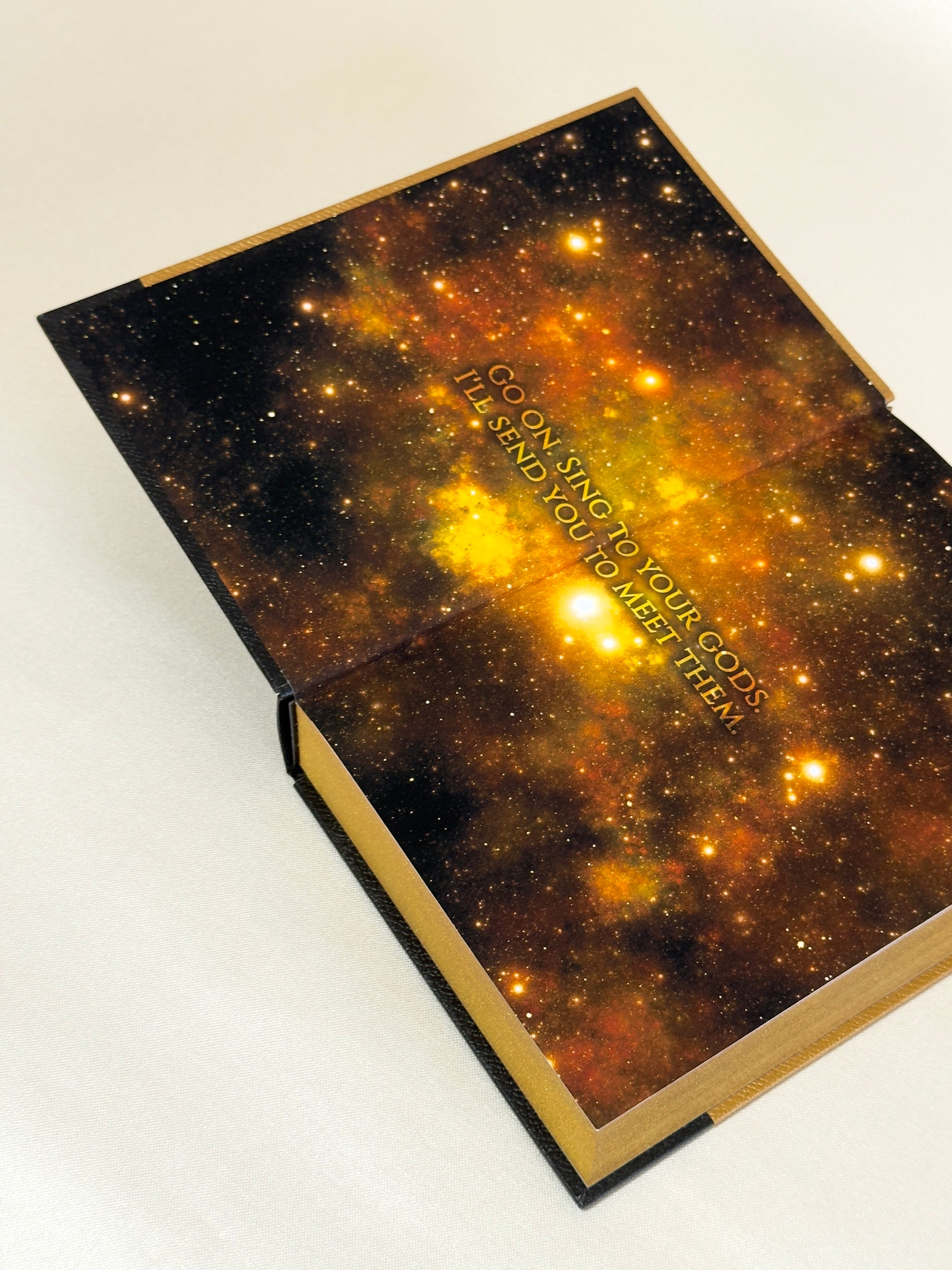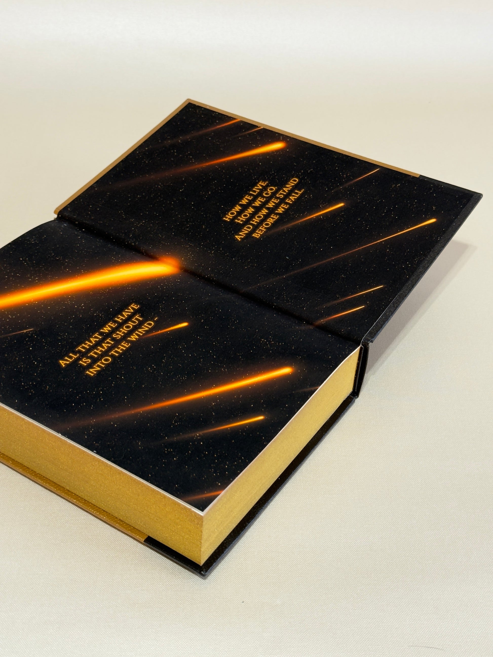 - Endpapers: gold galaxy and iron rain pictures with quotes ("Go on, sing to your gods. I'll send you to meet them." and "All that we have is that shout into the wind - how we live. How we go. And how we stand before we fall