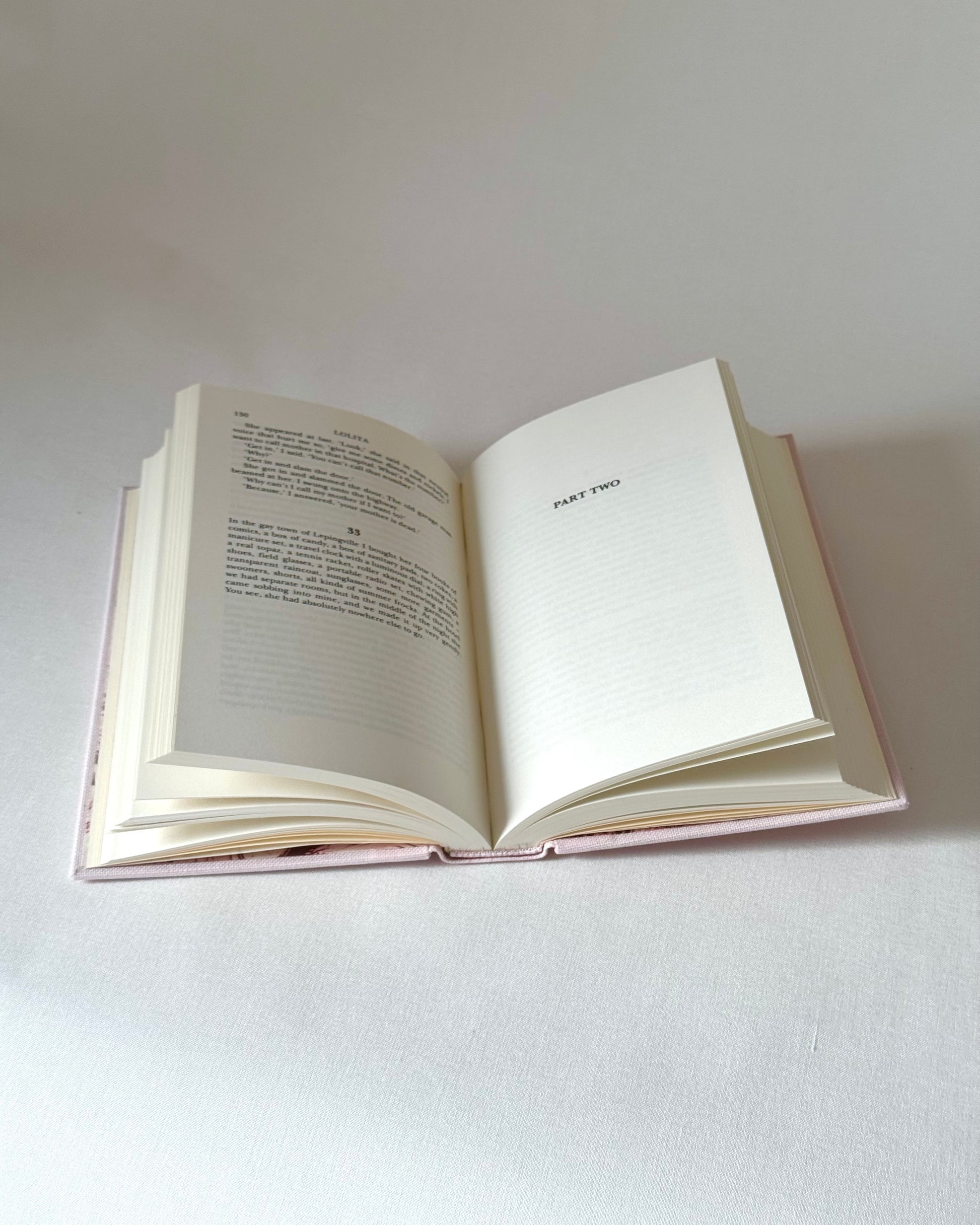 - Three piece case binding (à la Bradel) with light pink book cloth